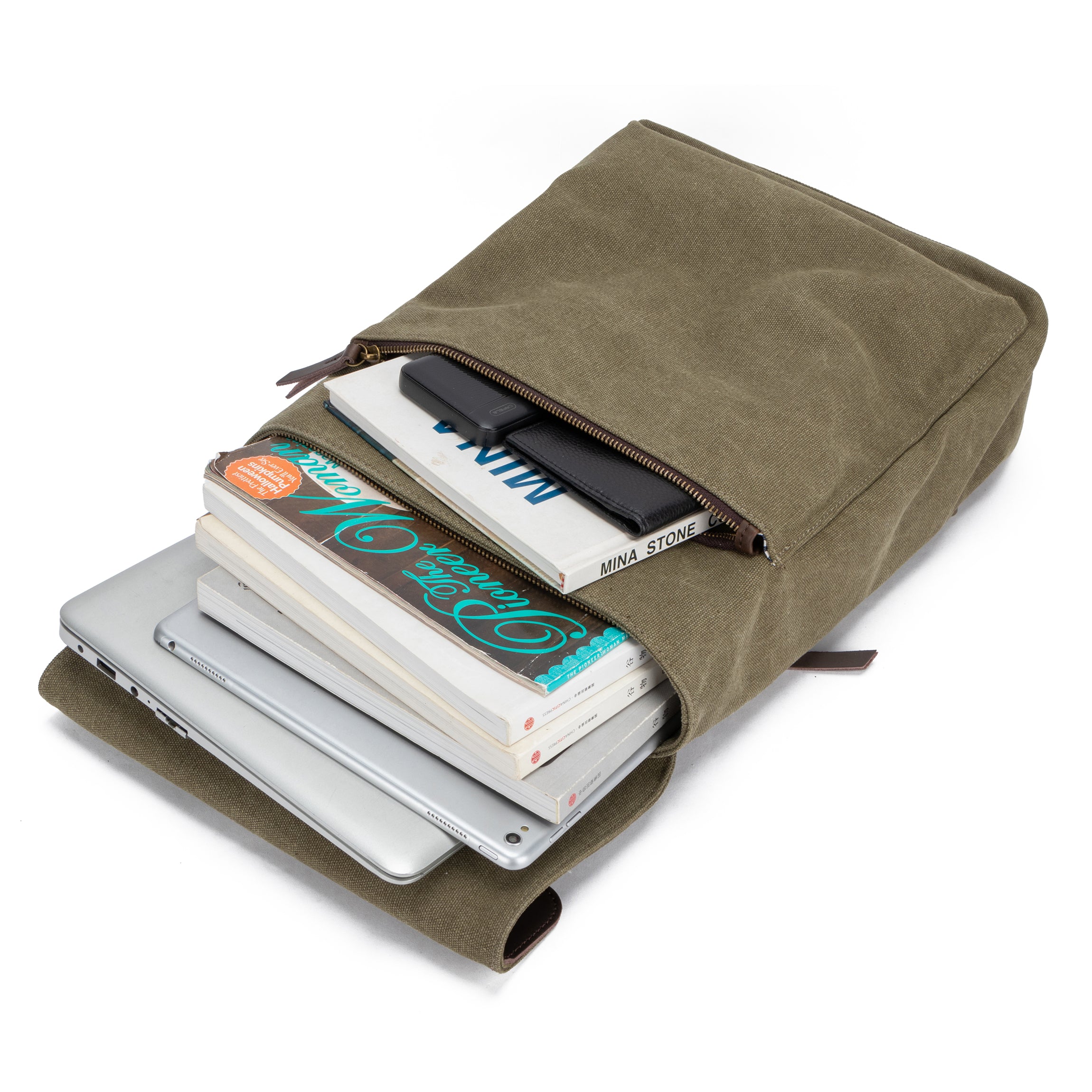 Le rabat est maintenu par une lanière en cuir, complétée d’une fermeture zippée principale pour sécuriser vos affaires. Les bretelles ajustables en toile et cuir assurent un confort optimal, tandis que la poignée supérieure vous permet de le saisir facilement à la volée.